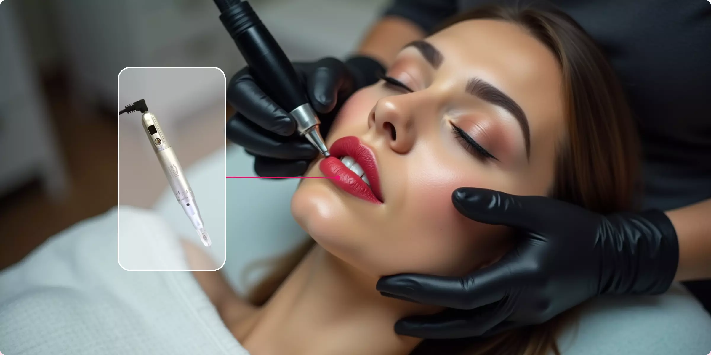 A permanent makeup machine uses a motor to drive a needle that moves up and down at a high speed. The needle will oscillate and deposit pigment into your client’s skin in a series of tiny, very close dots. You can adjust the machine's speed and the stroke length. It will help you control the depth of the tattoo and the resulting effect, such as solid lines for eyeliner or a softer, pixelated look for eyebrows.
