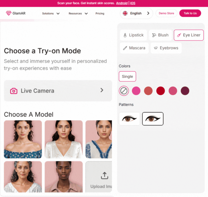 GlamAR AR engine has an AI-powered facial mapping and motion tracking to provide accurate alignment of the user's eyes. The eyeliner comes with a face tracking that maps the facial appearance of the user, creating a real preview of how each product would appear on the face. Our virtual beauty try-ons help to reduce the uncertainty of your customer and enhance their buying confidence.