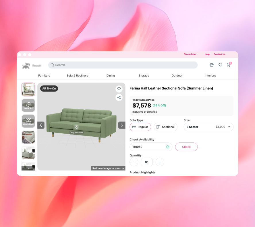 Add 360° viewer and real-time configurators so shoppers can adjust fabrics, finishes, and sizes, complete with live pricing